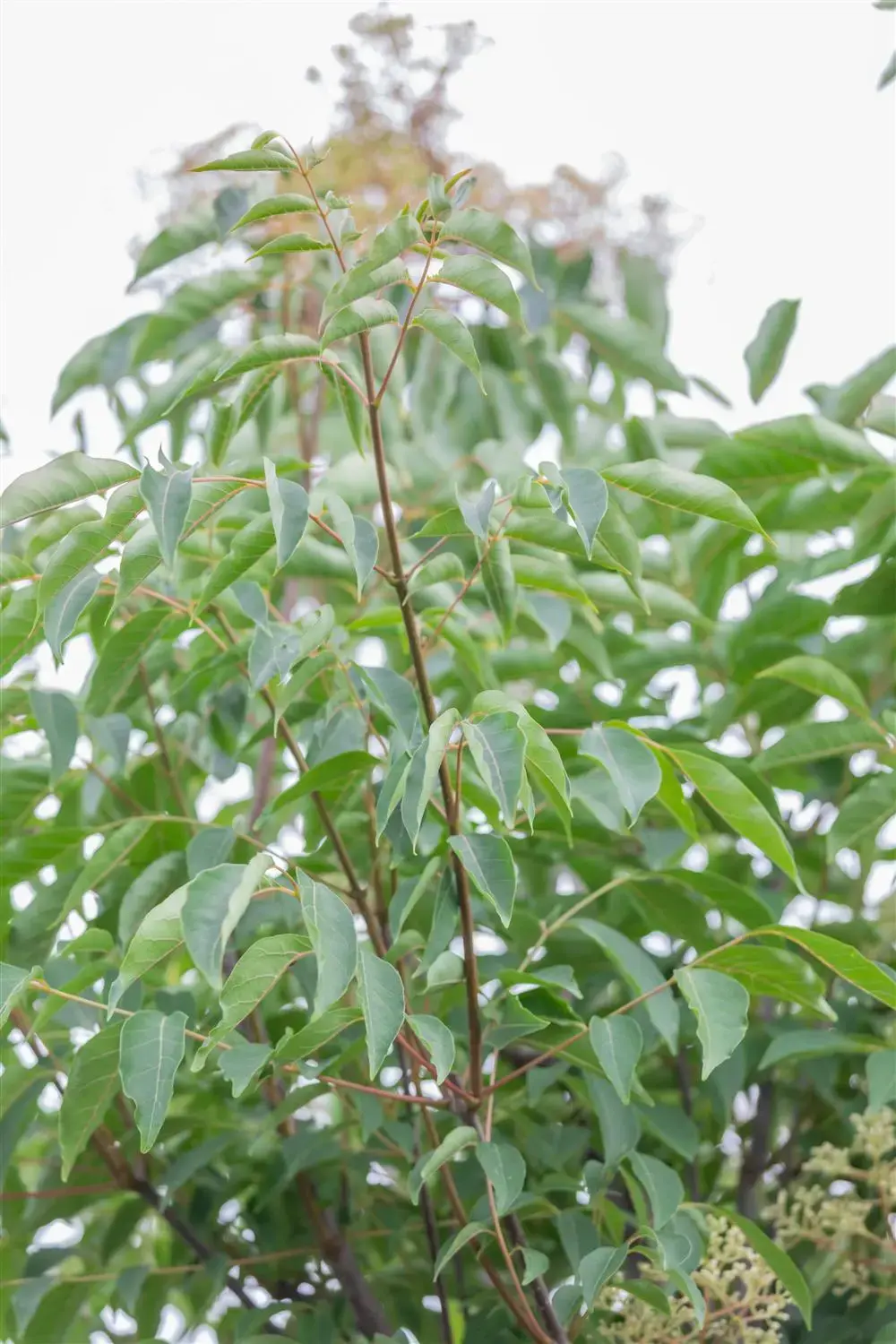 The Bee-bee tree (Tetradium daniellii) is a broad, roundish tree that produces white flowers arranged in panicles with a pleasant fragrance. They appear in August. These produce red-brown fruits. They exude a pleasant fragrance. The Bee-bee tree also has glossy, leathery, pinnate, medium green leaves. Its bark is red-brown in colour. In a sunny location with well-drained soil, it usually reaches a height of around 7 metres and grows to a width of around 5 metres.