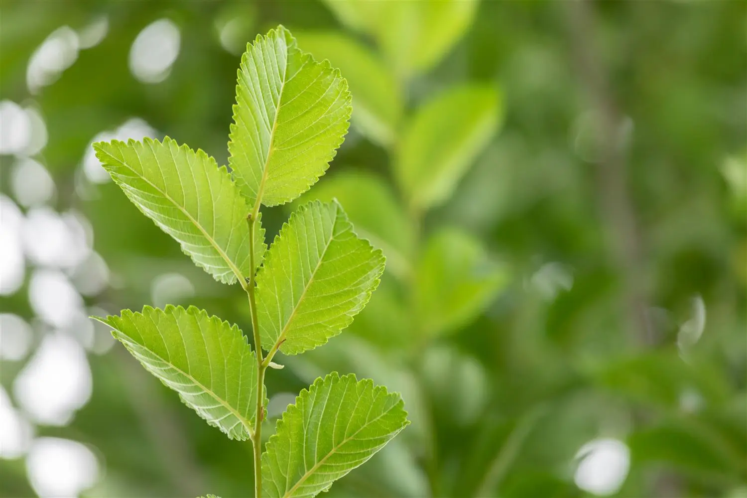 The Elm 'Lobel' (Ulmus) is a columnar small tree that produces light green flowers arranged in clusters. They appear from March to April. Green-brown winged fruits emerge from these from June. The Elm 'Lobel' also has matt, egg-shaped, medium green leaves. Its bark is silver-grey and smooth. In a sunny to semi-shady location with loose, nutrient-rich soil, it usually reaches a height of approx. 15 metres and grows to a width of approx. 5 metres.