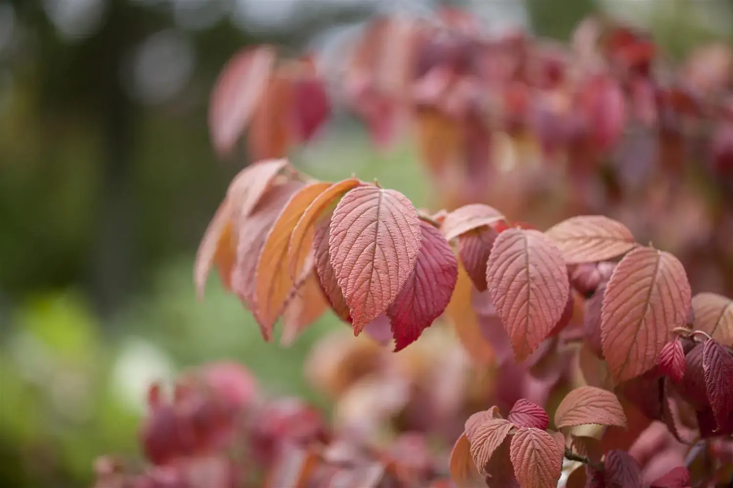 The deciduous leaves of the Japanese snowball 'Mariesii's are medium green, ovate, opposite, toothed. They are about 4 - 10 cm in size. Japanese snowball 'Mariesii' is bright burgundy to purple-purple in autumn.