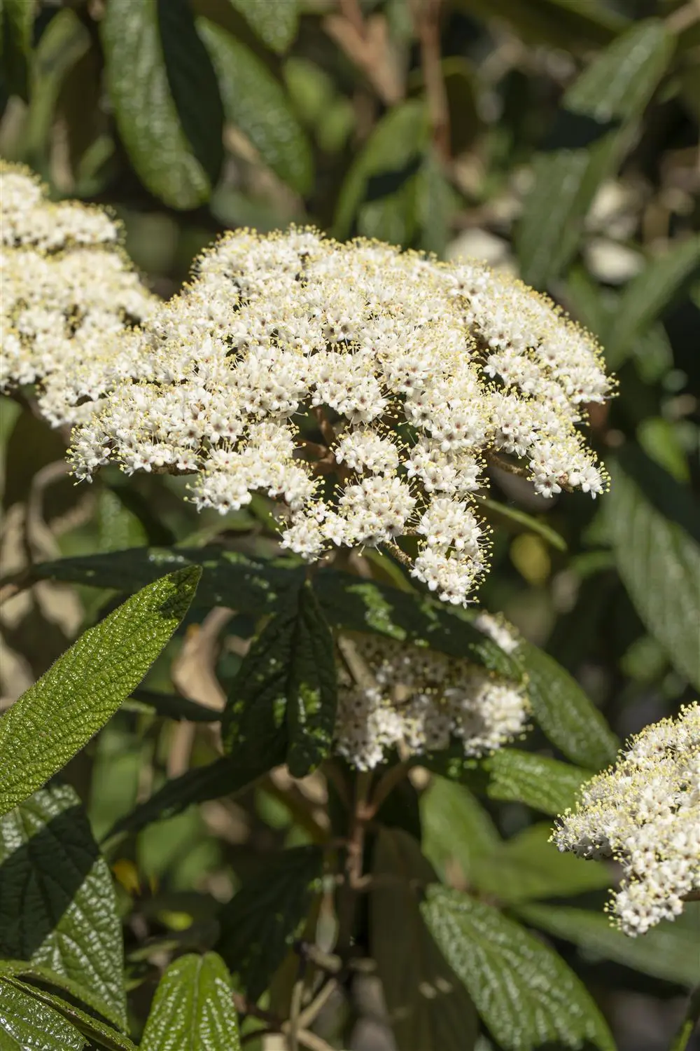 The creamy white flowers of the Wrinkled viburnum appear in umbrella clusters from May to June. They are pleasantly fragrant.