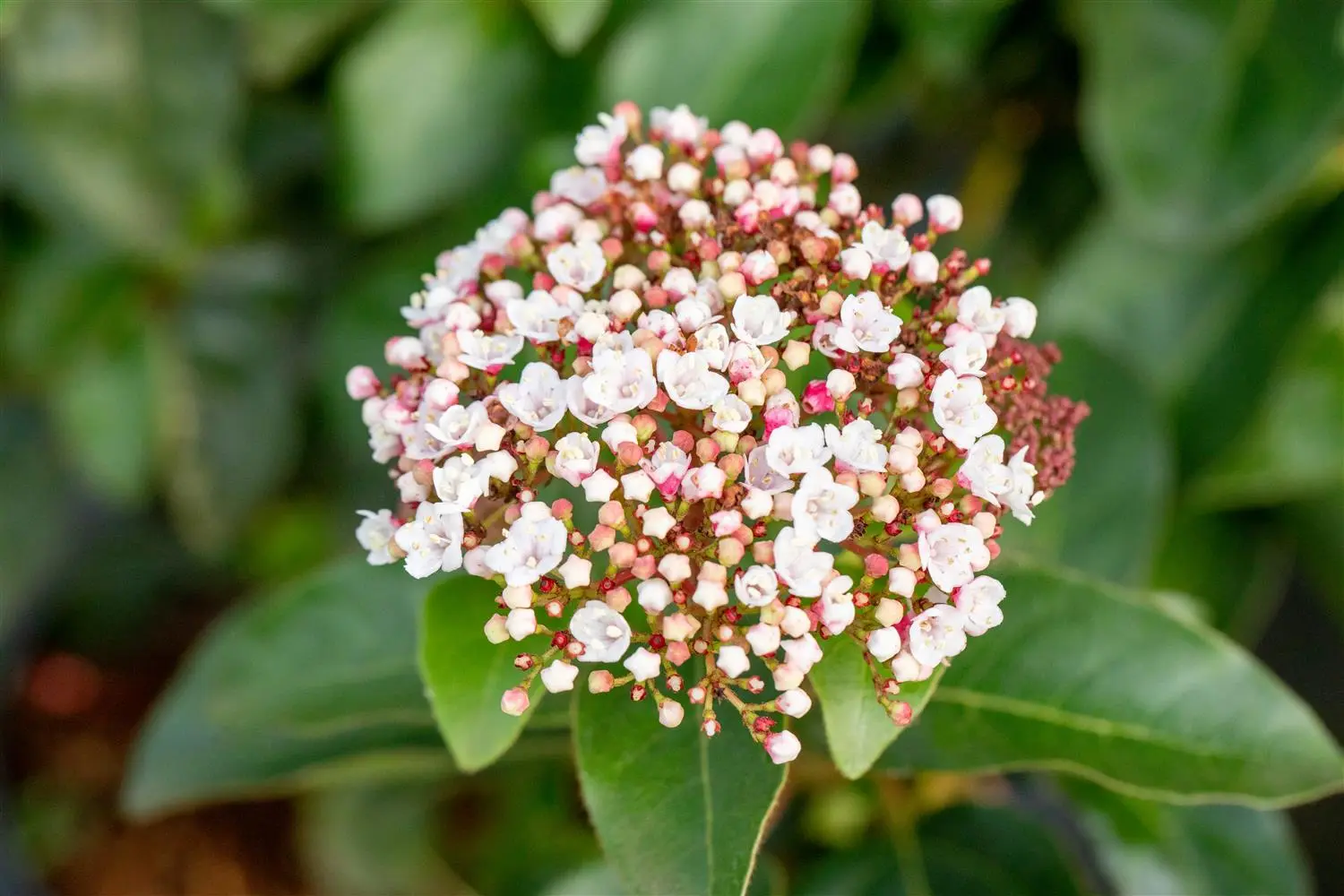 The light pink-white flowers of the Laurustinus 'Loren' appear in umbrella clusters from March to April. These are slightly fragrant. With the right care, re-flowering in November.