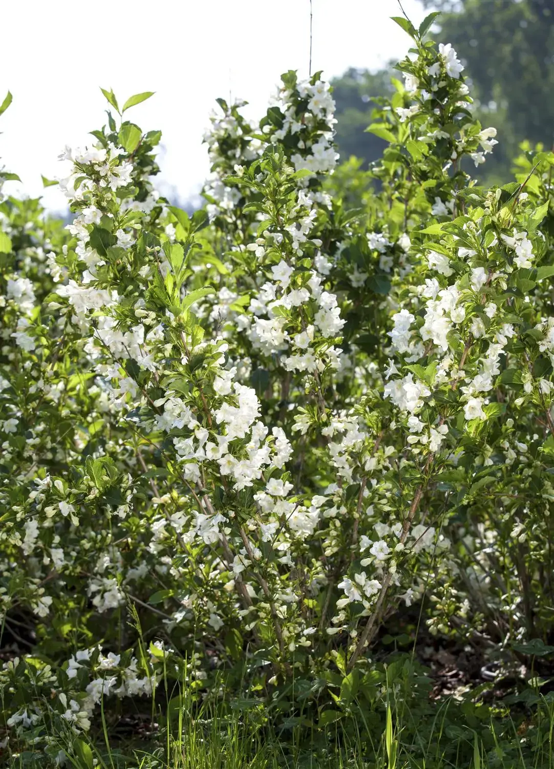The Weigela 'Bristol Snowflake' (Weigela) is a bushy, upright, dense shrub that produces white, funnel-shaped flowers. They appear from May to July. The Weigela 'Bristol Snowflake' also has lanceolate, dark green leaves. In a sunny to semi-shady location with loose, nutrient-rich soil, it usually reaches a height of approx. 2 metres and grows to a width of approx. 1.5 metres.