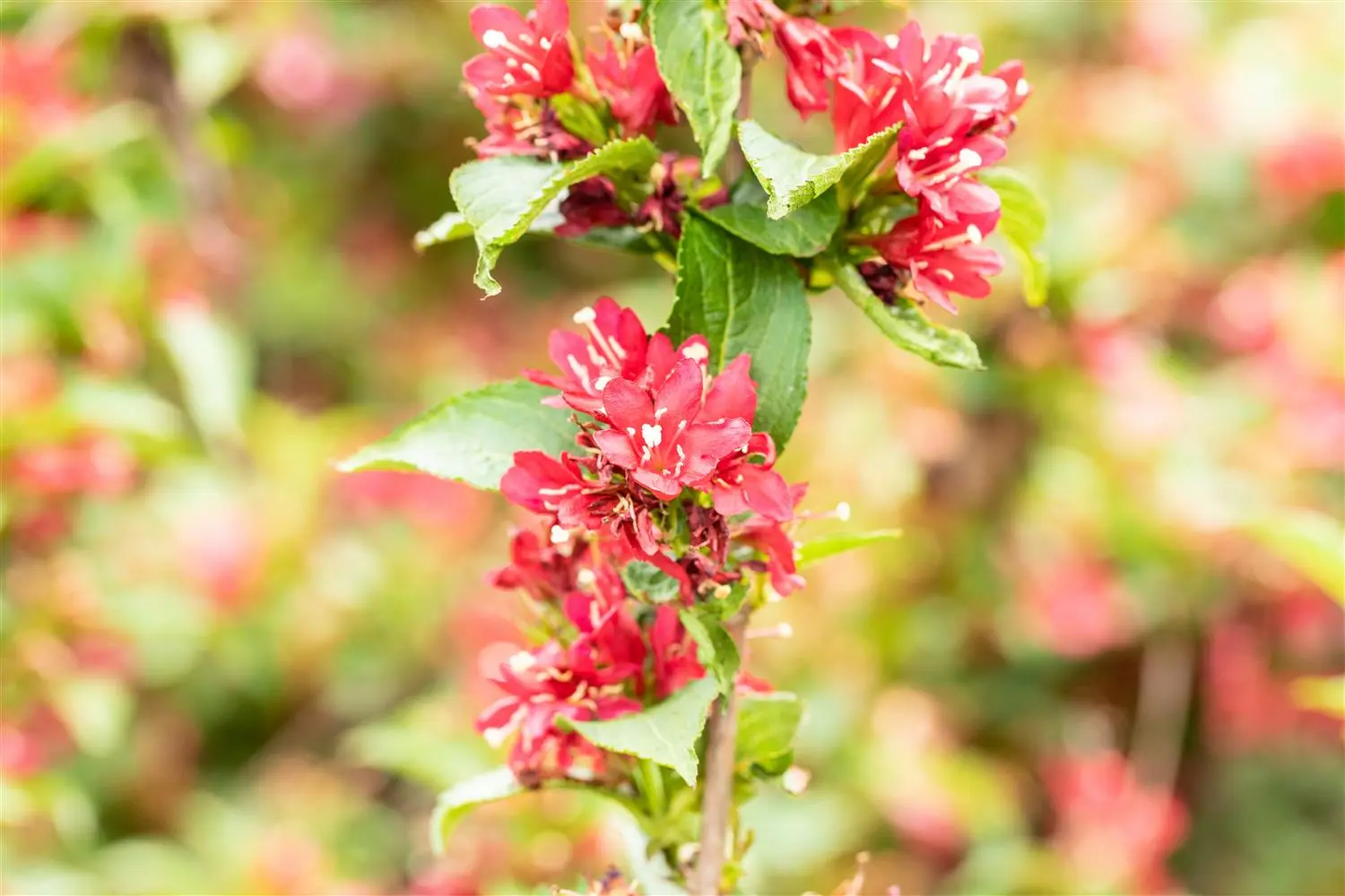 The Weigela 'Picobella Rosa' (Weigela florida) is an upright, compact small shrub that produces dark pink, funnel-shaped flowers. They appear from May to October. The Weigela 'Picobella Rosa' also has egg-shaped, light green leaves. In a sunny to semi-shady location with well-drained, nutrient-rich soil, it usually reaches a height of approx. 40 cm and is approx. 60 cm wide.