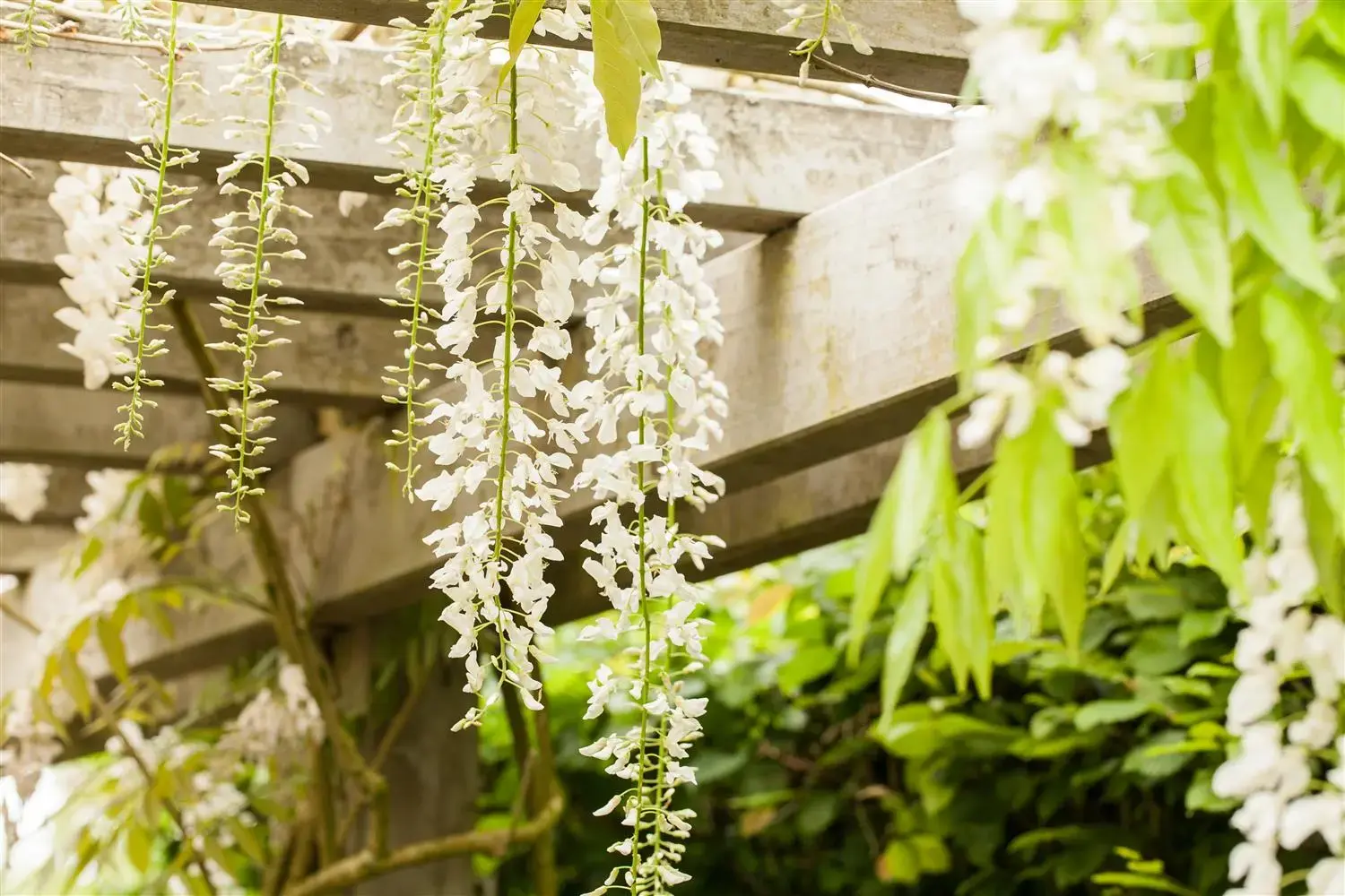 The white flowers of the Japanese wisteria 'Alba' appear in clusters from May to June. They are pleasantly fragrant.